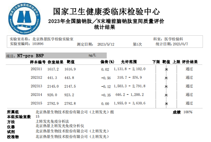 近日,國家衛(wèi)生健康委臨床檢驗中心(NCCL)公布了2023年多項全國臨床檢驗室間質(zhì)量評價結(jié)果。熱景生物旗下熱景醫(yī)學檢驗實驗室以100分的優(yōu)異成績通過“胃蛋白酶原”“血清降鈣素原”“N末端前腦鈉肽”“心肌標志物”等室間質(zhì)評項目。同時,熱景生物參與的上海市臨床檢驗中心2023年第一次能力驗證項目,包括B型鈉尿肽/N端-B型鈉尿肽前體、AFP異質(zhì)體比率、肌鈣蛋白I、降鈣素原等項目均通過驗證,充分彰顯了熱景生物穩(wěn)定可靠的實驗室質(zhì)量管理和檢測能力,以及強大的產(chǎn)品和技術(shù)實力!