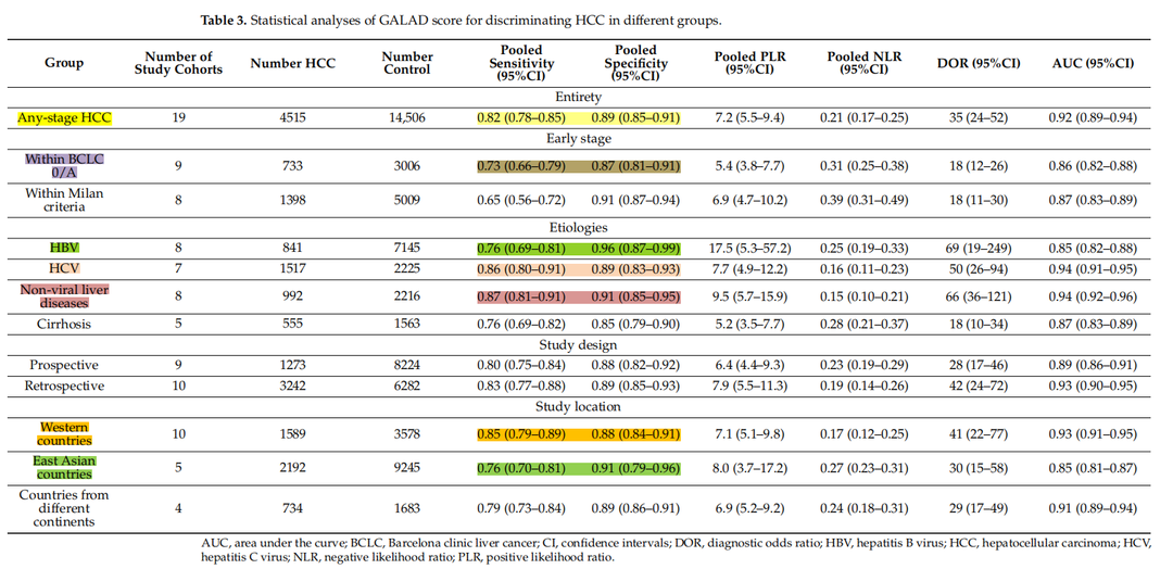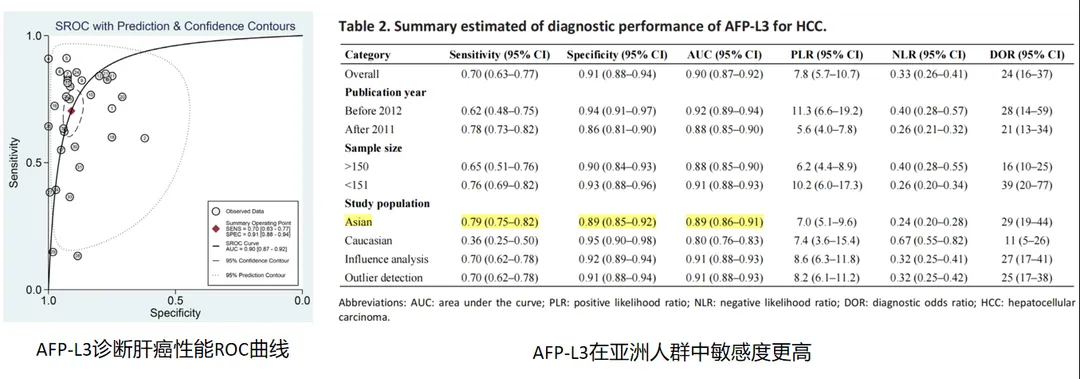 此外亞洲人群的研究顯示更高的敏感度和特異性—AFP-L3的敏感度為0.79(95% CI:0.75–0.82),特異性為0.89(95% CI:0.85–0.92)。
