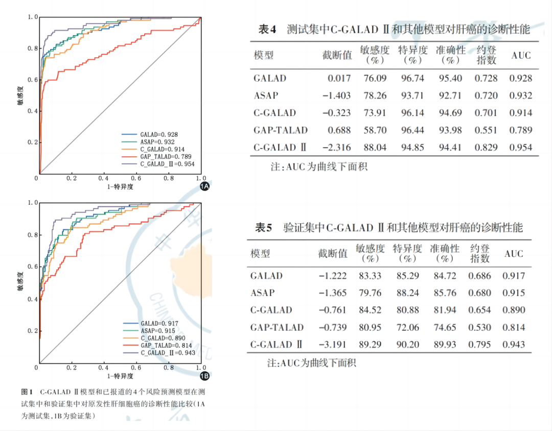 C-GALAD Ⅱ模型不僅保留了原有GALAD模型的優(yōu)勢(shì),還納入了更多影響因素,提升了對(duì)中國(guó)人群的適應(yīng)性和診斷準(zhǔn)確性。實(shí)證結(jié)果顯示,無論是內(nèi)部測(cè)試集還是外部獨(dú)立驗(yàn)證集,C-GALAD Ⅱ模型的ROC曲線下面積(AUC)高達(dá)0.954和0.943,敏感度分別為88.04%和89.29%,特異性分別為94.85%和90.2%,這些性能參數(shù)均優(yōu)于其他已報(bào)道模型。