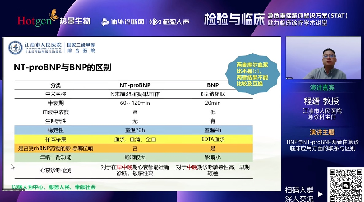 四川省江油市人民醫(yī)院急診科程縉教授就BNP與NT-proBNP兩個指標進行了深入剖析,從BNP與NT-proBNP病理生理機制出發(fā),解析了BNP和NT-proBNP之間的區(qū)別,全面的闡述了影響B(tài)NP和NT-proBNP水平的因素,又從檢驗角度強調(diào)BNP/NT-proBNP質(zhì)量要求和性能評價。最后程教授回歸臨床分享BNP/NT-proBNP在心衰早期篩查與一級預(yù)防、心衰的診斷與鑒別診斷和心衰治療監(jiān)測和預(yù)后評估等臨床價值。