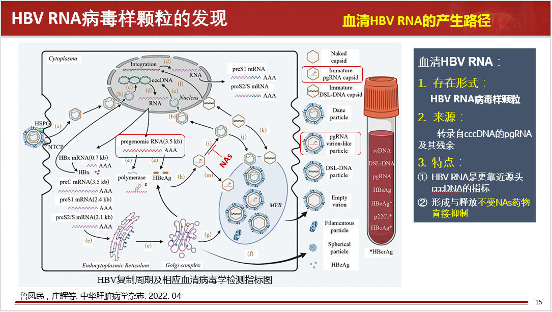 關(guān)于HBV RBA病毒樣顆粒的發(fā)現(xiàn)、血清HBV RNA的產(chǎn)生路徑、存在形式、來(lái)源和特點(diǎn)等做了詳細(xì)闡述,同時(shí)分享國(guó)內(nèi)肝病領(lǐng)域張文宏研究團(tuán)隊(duì)等工作成果,血清HBV RNA水平反映肝內(nèi)cccDNA的轉(zhuǎn)錄活性,血清 HBV pgRNA,是NA治療下HBV DNA < LLOQ后,能夠反映患者肝組織內(nèi)是否有cccDNA活躍轉(zhuǎn)錄的唯一指標(biāo)。