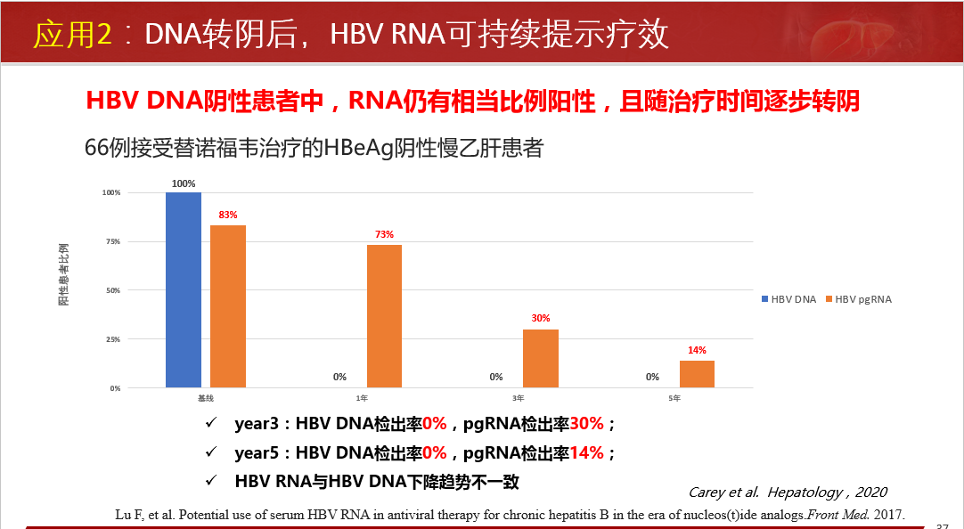 臨床應(yīng)用方面:指導(dǎo)安全停藥;NA治療下患者血清HBV RNA檢測(cè)陽(yáng)性預(yù)示更高的HCC發(fā)生風(fēng)險(xiǎn);NA治療下患者血清HBV RNA檢測(cè)陽(yáng)性,提示病毒cccDNA仍在有效轉(zhuǎn)錄表達(dá)病毒蛋白、組裝子代病毒顆粒樣pgRNA病毒顆粒。