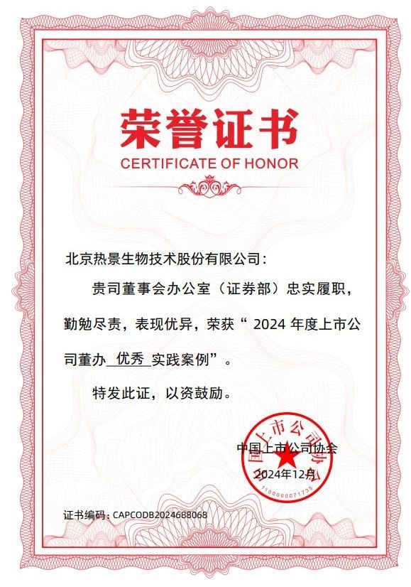 近日,中國上市公司協(xié)會開展的“上市公司董辦最佳實踐案例征集活動”結果揭曉,熱景生物榮獲“2024年度上市公司董辦優(yōu)秀實踐案例”,這也是公司連續(xù)第三年獲此榮譽。 “上市公司董辦最佳實踐”案例征集活動是中國上市公司協(xié)會對上市公司董事會辦公室履職情況進行評價,評價體系涵蓋了上市公司董辦工作所涉及的信息披露管理事務、公司治理機制建設、投資者關系管理事務等指標,于今年10月啟動,經(jīng)初審、專家委員會評審、誠信核查等環(huán)節(jié),最終評出最佳實踐案例280家、優(yōu)秀實踐案例300家。其中入選“董辦優(yōu)秀實踐案例”的300家上市公司中,滬市上市公司150家,占50%;深市上市公司146家,占48.7%;北交所上市公司4家。