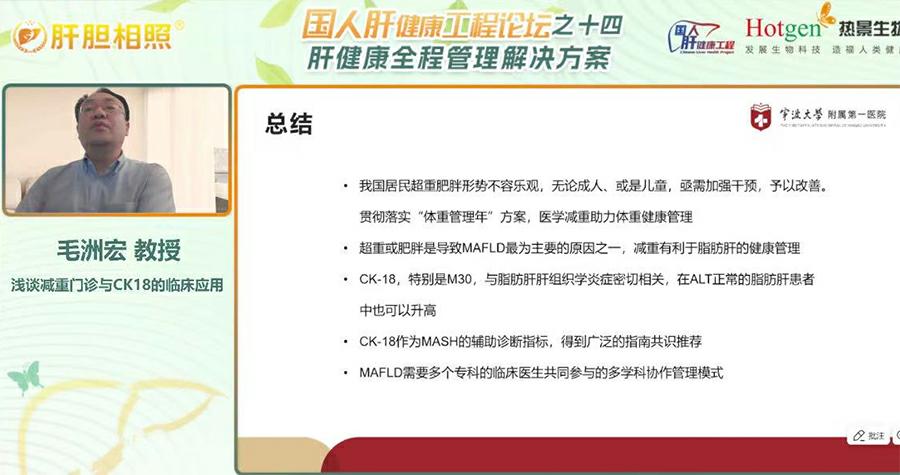 寧波大學(xué)附屬第一醫(yī)院內(nèi)分泌科毛洲宏教授在會議上圍繞“減重門診與CK18的臨床應(yīng)用”作專題報告,強調(diào)國家衛(wèi)健委“體重管理年”政策推動下,醫(yī)療機構(gòu)需加強減重門診建設(shè),為超重及肥胖人群提供專業(yè)化服務(wù)。毛教授也以本院“肥胖俱樂部”在開設(shè)近十年的真實經(jīng)驗,給我們科普了減重管理的重要性。目前,我國超重肥胖形勢嚴峻,超50%成人存在體重異常,肥胖與代謝相關(guān)脂肪性肝?。∕AFLD)密切相關(guān),約20% MAFLD患者可能進展為脂肪性肝炎(MASH),T2DM患者合并MAFLD比例高達65.04%。毛教授指出,傳統(tǒng)檢測手段如ALT、B超在早期診斷MASH及纖維化中存在局限性,而細胞角蛋白18(CK-18)片段作為新型生物標志物,通過M30/M65片段可無創(chuàng)評估肝細胞凋亡與壞死,其敏感性與特異性顯著優(yōu)于傳統(tǒng)指標。此外,MAFLD需多學(xué)科協(xié)作管理,結(jié)合減重、改善代謝、抗纖維化等綜合干預(yù)措施,定期監(jiān)測高危人群。毛教授總結(jié)稱,CK18的應(yīng)用將推動MAFLD精準診療,而政策支持與多學(xué)科模式普及,為肥胖及相關(guān)代謝疾病防控注入新動力。