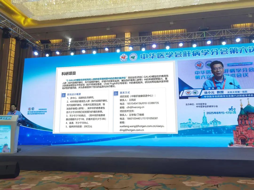 ? “揭榜掛帥”助力肝癌早篩研究:為加速肝癌早期預(yù)警技術(shù)的臨床轉(zhuǎn)化與精準(zhǔn)應(yīng)用,徐小元教授在會上重磅發(fā)布“C-GALAD模型預(yù)警肝癌風(fēng)險(xiǎn)”揭榜掛帥科研項(xiàng)目。該項(xiàng)目投入200萬元科研經(jīng)費(fèi),面向全國招募具備肝癌高危隊(duì)列資源的醫(yī)院或研究機(jī)構(gòu),合作開展多中心、大樣本量(4000例)的回顧性研究。研究旨在深入評估C-GALAD模型(整合AFP、AFP-L3%、DCP及年齡、性別)在不同類型肝癌高危人群(如肝硬化、肝癌術(shù)后、肝衰竭等)中的早期預(yù)警效能及其亞組表現(xiàn)差異,研究將幫助臨床更早期地識別肝癌風(fēng)險(xiǎn),并為患者提供個性化的監(jiān)測與治療建議。