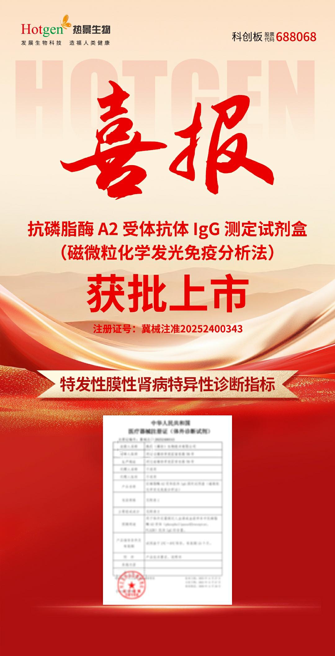 熱景生物始終以“解決臨床痛點,精準賦能臨床”為核心方向,此次抗磷脂酶 A2 受體抗體 IgG 測定試劑盒的獲批,進一步完善了公司在腎病精準診斷、慢病管理賽道的產(chǎn)品矩陣,讓更多患者享受到 “精準、便捷、經(jīng)濟” 的診斷服務。未來,熱景生物將繼續(xù)以技術創(chuàng)新為引擎,在生物醫(yī)藥領域持續(xù)突破,為提升我國臨床診斷水平、守護國民健康貢獻更多力量!