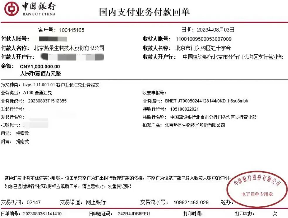 熱景生物一直密切關(guān)注著汛情救援進展,主動聯(lián)系相關(guān)部門提供支援幫助,并向北京市門頭溝區(qū)紅十字會捐贈100萬元防汛抗洪資金,助力當?shù)卣蜕鐣α靠箵魹?zāi)情。